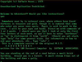 Microsoft Adventure is a 1979 interactive fiction game from Microsoft, based on the PDP-10 mainframe game Colossal Cave Adventure, and released for the TRS-80, Apple II, and later for the IBM PC