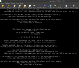 CyberSphere is a Role-Playing MOO set in a dark American future. Your virtual journey begins in New Carthage, the denizens of which range from the benign eccentric to the malicious psychotic. Shadowed alleys conceal dark secrets, and gleaming towers of urban wealth hide fantastic conspiracies.