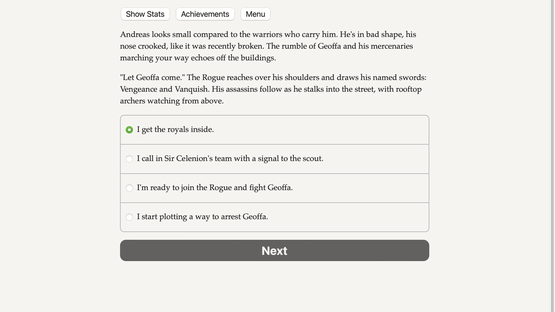 Pursue love and glory with unruly royals, seductive Fae, and rogue assassins in this epic text-based RPG romance set in a kingdom on the brink of war. As a member of the royal guard, it is your duty to protect the heirs to the throne, but the rebellious siblings lead you on a merry chase outside the palace. They open you up to a world that you never knew before: a secret network of assassins, corrupt city officials, and a cabaret brimming with songs, spirits, and sex. And when you are done carousing in the city, you can move into the dark of the magic-filled forest, where demigods and Fae throw jubilant, bacchanal revels, which include orgies for those so inclined
