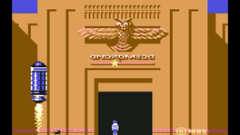 Scarabæus is a 3D adventure game made by Andromeda in 1985. It is also known as "Invaders of the Lost Tomb" in North America. The game starts with the player landing his spaceship near an Egyptian tomb. He wears a spacesuit and is followed by a dog. His aim is to collect the ancient treasure of Scarabæus, a smaragd in the shape of a dung beetle kept inside the tomb. Although it's not shown in the presentation, the explorer gets bitten by a spider upon entering the temple. The tomb contains several vials with an antidote, and several others with poison, and the explorer must solve some puzzles that will reveal which ones he can drink and which ones he must avoid. He also must survive hostile monsters that will try to kill him. The game is divided into three maze-like floors, each with its own goals. The ultimate target is to survive and recover the Scarabæus, held in the Pharaoh's Tomb. Along the way, the player needs to keep an eye on the explorer's health, shown on the instruments on the right of the screen.