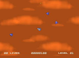 An Atari Jaguar CD homebrew game that is heavily inspired by Konami's arcade game Time Pilot. Kobayashi Maru is a 50/60 fps rotary action shooter for the Atari Jaguar games console and was written utilising a version of RAPTOR API by Reboot. It can be played with either a rotary controller (such as Chaos Reins, Tyrant or Jonathan Ascough pad) or a regular Jaguar joypad. Xu’s United Nations Tetrad are under simultaneous attack from The Ebil Alliance. All that stands between TEA and the XUNTS is you and your warpships. You are the only officer capable of piloting these ships and are therefore the last hope of all XUNT-kind. As your prototype warpships do not come fitted with stabilising or reverse thrusters, your ship tears around the upper atmosphere with regular engines at full output. Your task is to steer the warpship, avoid collisions and kill the attacking drones. Once the required number of drones have been dispatched, their mothership will arrive and attempt to seek revenge. Defeat this mothership and you’ll charge your warp engines and be off to the next planet where you’ll find new drones are on the attack. Some drones have taken your fellow XUNTs hostage – you are able to rescue these falling hostages by catching them with your ship, but beware – if you destroy their baloonachutes they’ll fall much more quickly. Chain hostage rescues for increased bonuses, lose a warpship and the chain will reset. As you defeat drones, your allies below collect their wreckage, recycle it and construct further warpships for your use. 1st extra warpship at 20,000 and every 50,000 afterwards. Lose a warpship and your allies will transport a new one to your position. TEA wins when you no longer have any warpships to replace your damaged vessel.