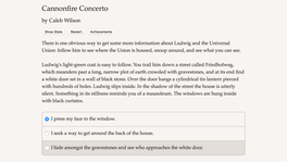 Cannonfire Concerto is a 190,000-word interactive novel where your choices control the story. It's entirely text-based - without graphics or sound effects - and fueled by the vast, unstoppable power of your imagination. Play as male, female or non-binary; gay, straight, bi, or asexual. For some, romance is a means to an end. For some, it's a sonata duet of love and sex. Perhaps both. Will you and your Genius achieve immortality, or will the poisoned pens of critics slaughter your career? Will you overthrow the church, bringing forth a new era of enlightenment, or defend your kingdom from a secular invasion? The concert hall is silent. The Cannonfire Concerto is about to begin.