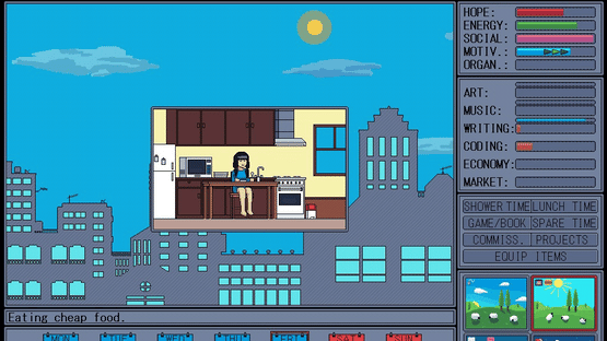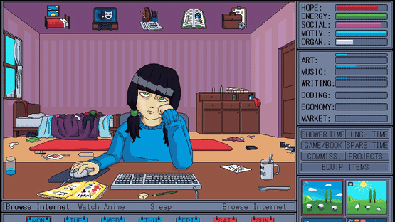 Right after moving to a big city and getting a new apartment, you were fired from your job! And now you don't want to go outside again! Improve your skills, manage your time and find a way to make money without having to leave the room! Watch as your plans go down the drain and you sleep through the whole week!