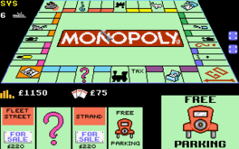 This version of the classic board game supports several graphic formats and offers some different options. From 2 to 8 players can play the game, and they can all be computer players if you wish. This allows you to just sit back and watch as the computer takes over. You can choose to play a short game with a specified time limit, or a standard game, and there is a save game feature. All actions are handled entirely by keyboard. Questions appear in the center area of the board (for buying property, for instance). Pressing the first letter of a word from the top bar takes that action (Q for Quit as an example). Player stats can be viewed on the screen.