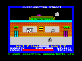 Imagine a French chimney sweep called Smudge....It's not easy, and neither is our hero's task! He has to clean all the chimneys in the village of Le Crelle before he can go home. He has already been hampered on his way to work by drivers on the wrong side of the road, sudden obstacles and bouncing footballs projected into the street by ruffian school kids. Once he has parked his bike in the lay-by, you've got to help him use his Jetpack to mount the roof and lower him into each stack. Only then do you discover that everything is not well. Strange airborne creatures - the "Moonees" - well known local pranksters, looking for fun, try to knock Smudge off the roof again and again. But with all that Galic charm and some help from you he perseveres, and as the say in Paris "If at first you don't succeed, it's time to make a clean sweep". Therefore after each screen you must return to the local laundry and rest so that Smudge can regain his strength to tackle the next type of building, before finally achieving his ambition - to clean the towers of the Mayor's mansion.