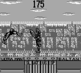 Game Boy Port of "Ultraman". Based on the popular television show from 1967, Ultraman directly follows the story of its source material. Cast in the role of the titular Ultraman, the player must defeat many of the same monsters that appeared in the original series. Taking the appearance of a 1-on-1 fighting game, Ultraman can punch, kick, and grapple his opponent, as well as use a variety of various special moves that must be charged. However, in order to actually defeat his opponent, Ultraman must deplete their continually-recharging life bar, and at that moment hit with his most powerful special attack: the Specium Beam. As the game continues, different enemies may even find ways to avoid this most formidable attack, and Ultraman must adapt... Each stage has a time limit of only three minutes, and there are three lives and no continues.
