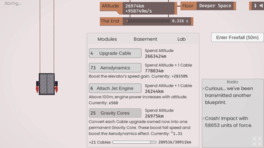 Welcome to the secret laboratory Elevator Station, the testing site for our brand new elevator design. You'll oversee the design as you send then elevator flying into space, or crashing into the ground - in the name of science! Going deeper allows you to find new technology buried under the ground. What goes up, must come down.