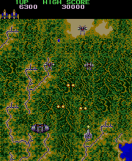 The player starts out as a ship fighting over North America. Capsules are shot from the ground, that when shot open contains either a ship upgrade or powerup. Transformation - The very first item that comes out of the capsule is an upgrade that transforms the ship into a flying robot that has a shield. This shield can take a few hits before transforming back into a ship. - With each upgrade the robot transforms and gains a different type of weapon. - Pressing button 2 (B) will let the Robot use his shield to block shots head on. Power ups - After shooting the capsule open, if they player shoots again the ship upgrade will change to a power up. - Power ups include bonus points, stopping enemies for a certain amount of time, and becoming indestructible for a limited amount of time. During this indestructible phase, the ship/robot cannot shoot but can fly into enemies for tremendous amounts of points.