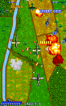 A shooter like many others. Shoot planes, tanks and a train. Very large bosses at the end of each level. Many power-ups like smartbombs, missiles and lasers. There is also some speech in the game.