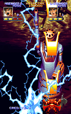 Mazinger Z is an Action game, developed by Eleven (Japan) and published by Banpresto, which was released in Japan in 1994.This is shooting game in which you will be able to pick your character between Mazinger Z, Great Mazinger and Grandizer, each of them with their own strengths and weaknesses... yep, appears that although the name of the game only has one of those robots, you can control one from the 3 of them, or 2 if you will be playing in the usual 2-player game, which requires a friend of yours to spend his own coins.