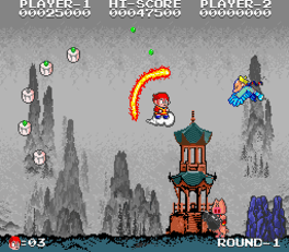 Enter the wild, fun-filled world of Mike Chen. He's out to learn the secrets of the five lands so he can become a powerful wizard of the skies! Already he has tamed a cloud to carry him around. He has learned the art of the shooting Ki force from his fingertips! but standing against him are more wacky, zany creatures than you can shake your chopsticks at! Bird men. Flying cat heads. Pigs with guns. And flying bowls of soup! Sounds funny...but remember that each can zap you with a touch! You do have a couple of tricks up your sleeve. Collect power-up pots to fly faster and make your Ki force even more powerful! Defeat the mid-round bosses and you will earn the use of true magic...fireballs, guardian flames and bouncing bombs. Defeat the five world guardians and you'll become a Cloud Master! Fail, and you'll be locked in combat forever. Are you really going to let a flying dumpling get the best of you?