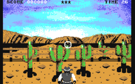 Shoot-out is a traditional arcade western shooter and it takes place in the desert landscape of Gulch Creek. Each level is composed by two distinct scenarios. The player will play as Quick Hand Luke.