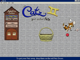 Catz 2 is the second game in which you are given catz to play with on your computer. In this sequel there are many breeds to choose from including shorthairs and siamese. There are also many environments for them to play in. In the playpen where you can keep an eye on them, full screen mode where your catz can play over open applications and programs, active full screen mode where they can play behind open programs and applications. Finally there is screen saver mode where your catz can protect your computer if you set up password activation. Along with the above there is also the petz supply shelf where you will find many toys for your catz to play with. On the shelf you will also find the paint tin which gives you the option to paint your catz any colour you wish. If you own the first catz game it is also possible for them to play in the new environment of catz 2 so you don't have to give up caring for your catz from the first game.