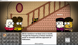 Night of the Shrub Part 1 is a short, visual novel, with a single storyline full of October surprises - A boy named Shrub, and his three friends, go looking for adventure in a creepy, abandoned house, and find a whole heap of odd happenings.